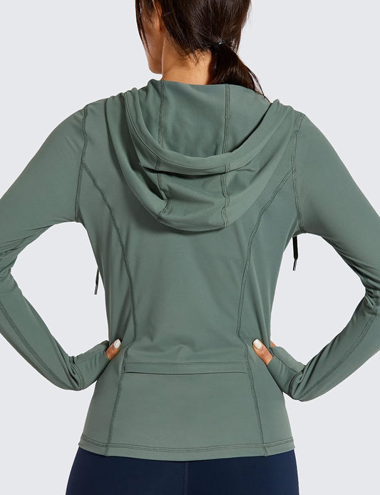 Chaqueta con capucha y cremallera completa cepillada para mujer, chaqueta deportiva con capucha para entrenamiento, atletismo y bolsillos con cremallera